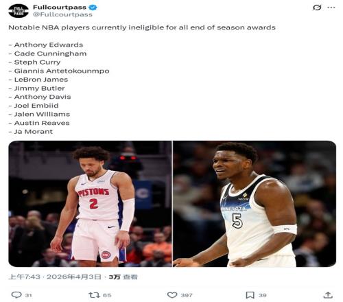65場(chǎng)規(guī)則的目的,是防止球星輪休,保證球迷買票能看到人。出發(fā)點(diǎn)是好的,但執(zhí)行起來(lái)太僵硬。像愛德華茲這種,一場(chǎng)打了3分鐘傷退,也算“出場(chǎng)”了,但規(guī)則不認(rèn)。像坎寧安這種,氣胸不是他能控制的,硬撐著打可能會(huì)出事。不撐,沒獎(jiǎng);撐了,可能廢。球員夾在中間,兩頭不是人。