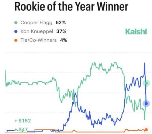 根據(jù)預(yù)測(cè)平臺(tái)Kalshi更新的本賽季最佳新秀概率,弗拉格憑借最近兩場(chǎng)的爆發(fā)表現(xiàn),他的獲獎(jiǎng)概率飆升到62%,力壓克努佩爾佩爾37%,兩人共享獎(jiǎng)項(xiàng)的概率是4%。