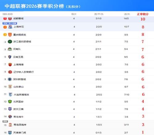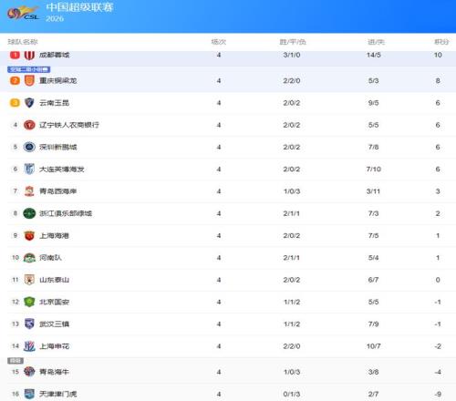 2026賽季中超聯(lián)賽前4輪戰(zhàn)罷,看著這個有提前扣分的積分榜(下圖),有的球隊(duì)歡喜,有的球迷悲傷。成都蓉城無疑是大贏家,前4輪3勝1平保持不敗,以10分高居中超積分榜榜首。升班馬重慶銅梁龍成為一匹黑馬,2勝2平同樣以不敗的戰(zhàn)績屈居積分榜第二。中超二年級生云南玉昆也表現(xiàn)搶眼,2勝2負(fù)積6分排在第三。